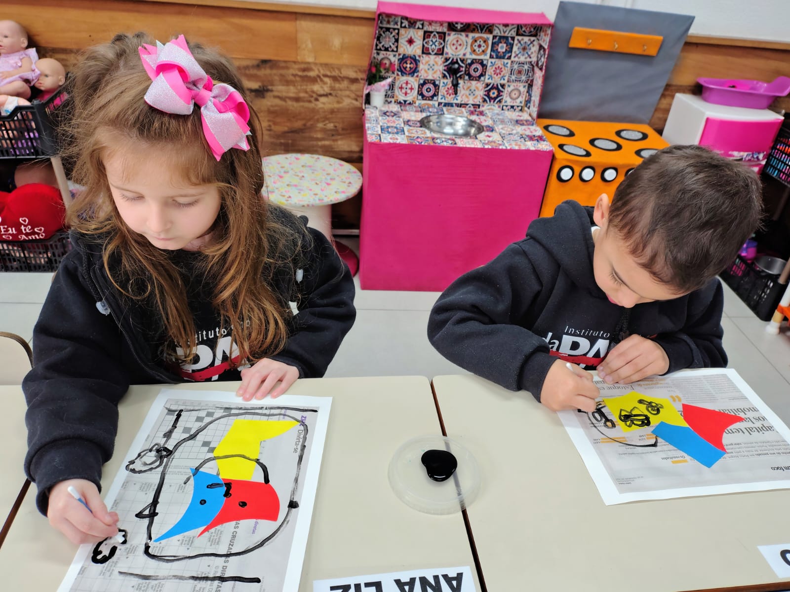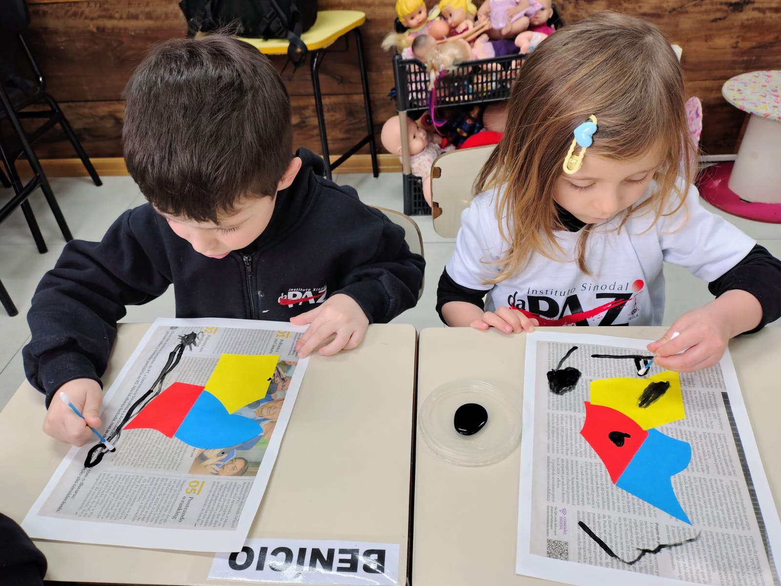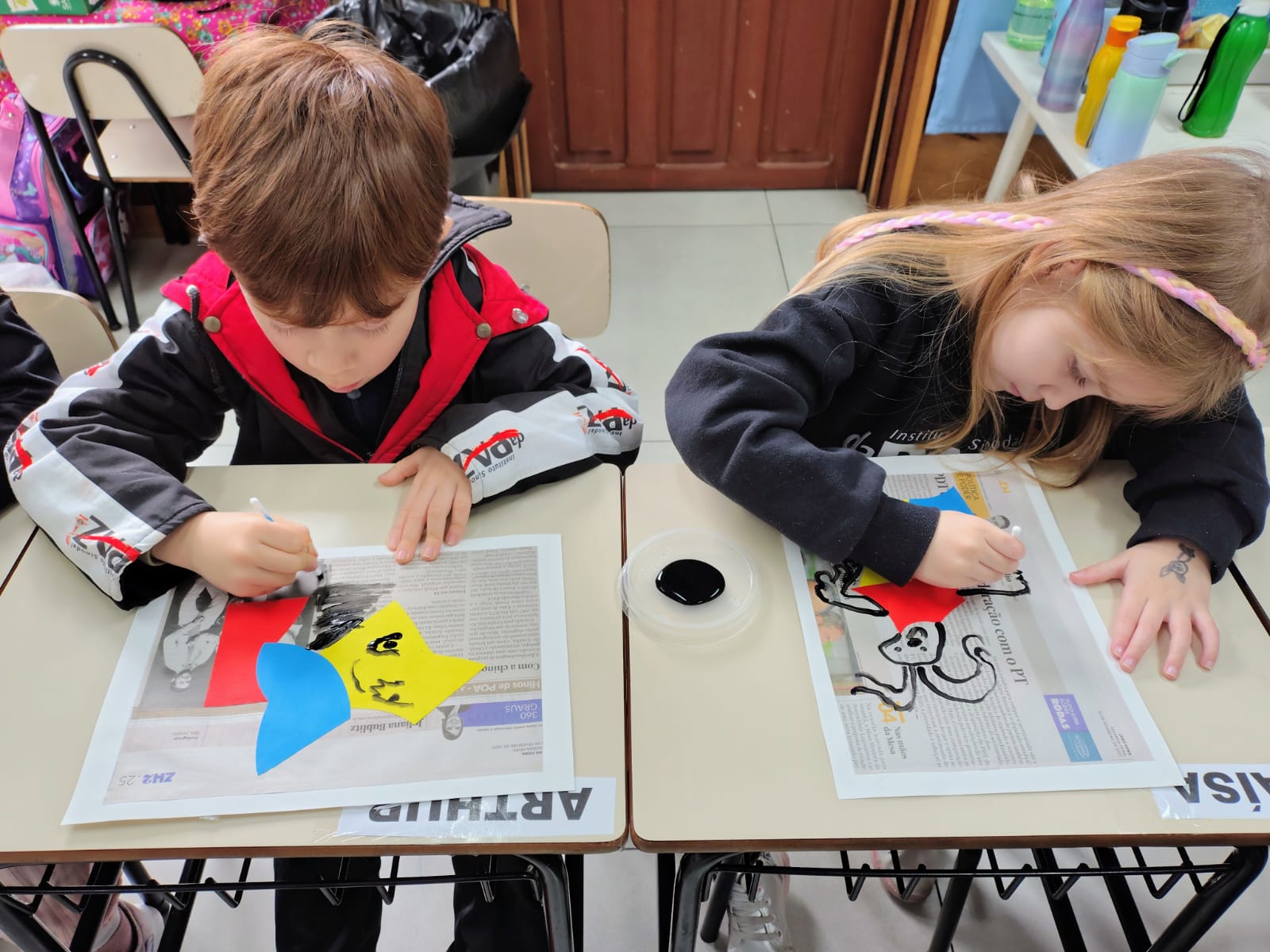 A proposta envolveu o desenho com interferência de papéis colados, complementado pela pintura em tinta preta, criando composições cheias de expressão e criatividade.