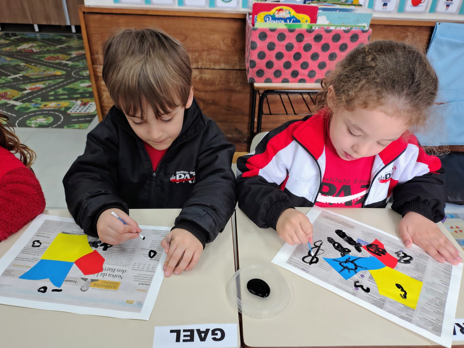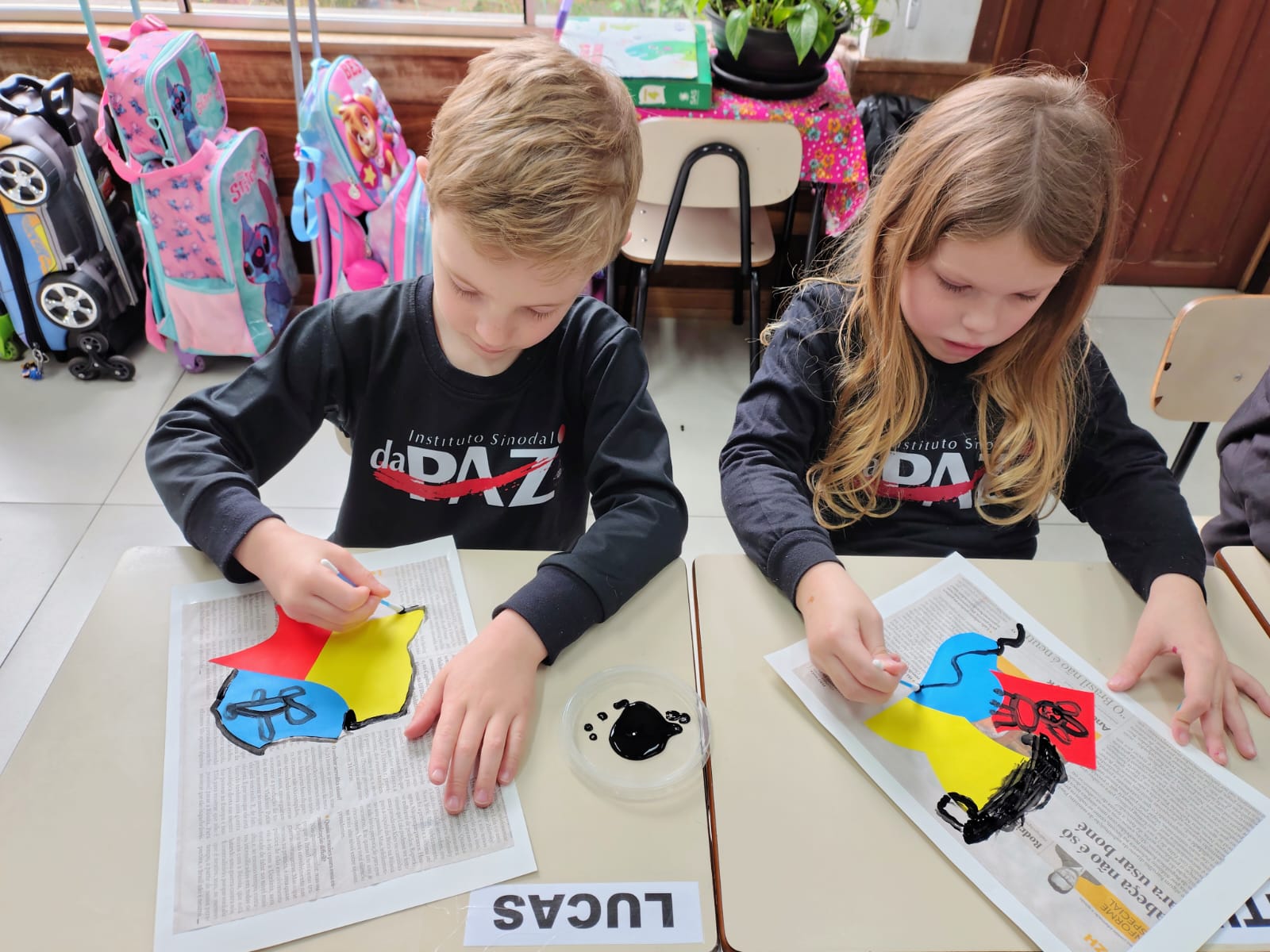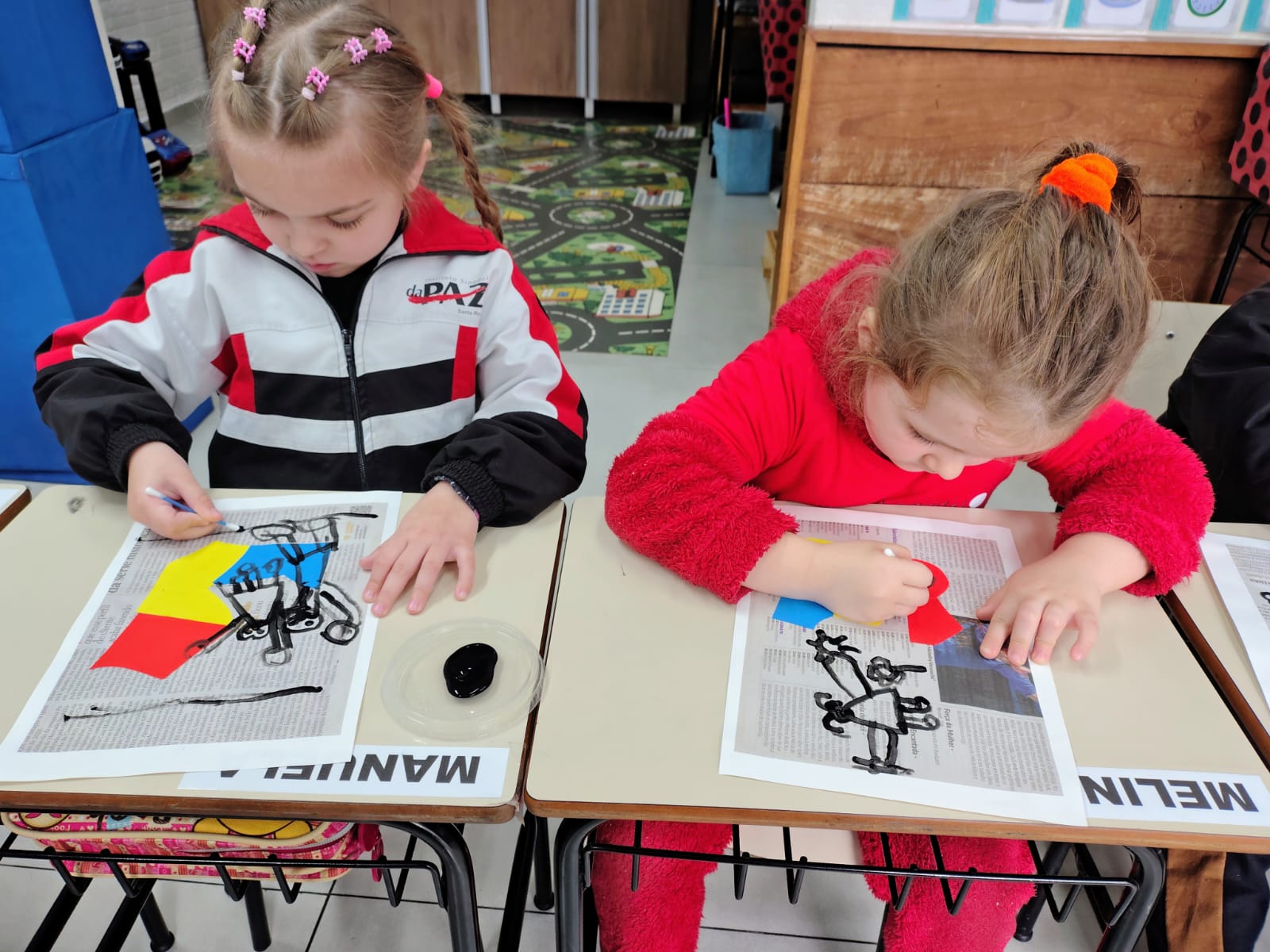 A proposta envolveu o desenho com interferência de papéis colados, complementado pela pintura em tinta preta, criando composições cheias de expressão e criatividade.