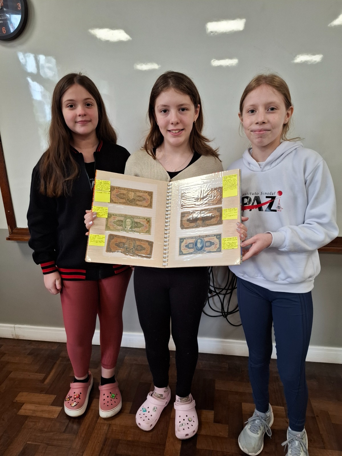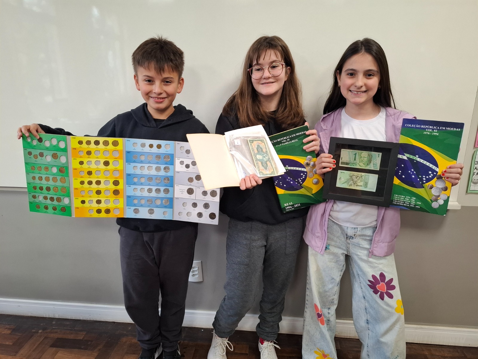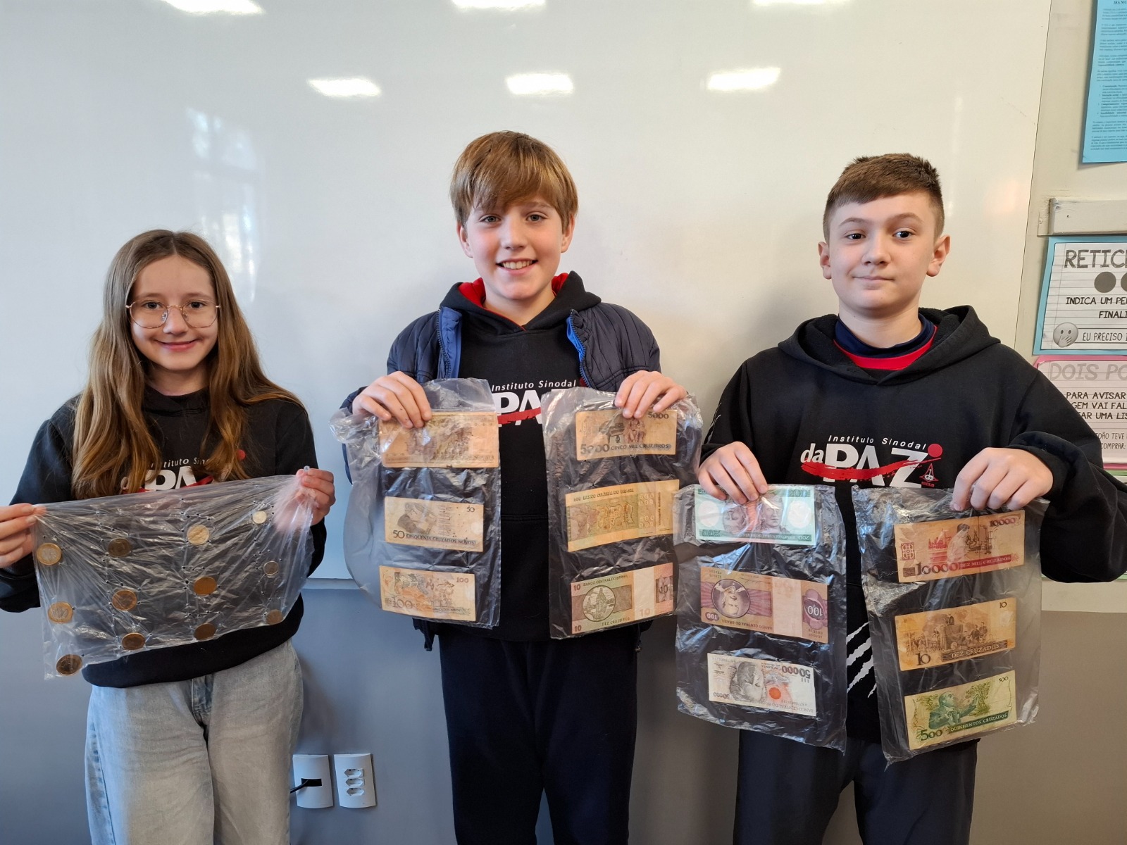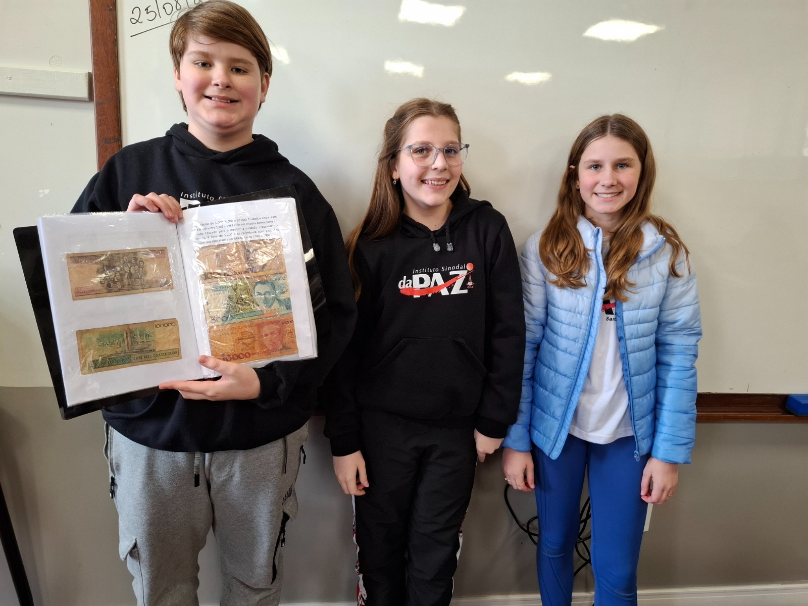Durante a atividade, que integrou as aulas de Educação Financeira, foram apresentadas moedas desde os tempos do Réis até a moeda atual, o Real.