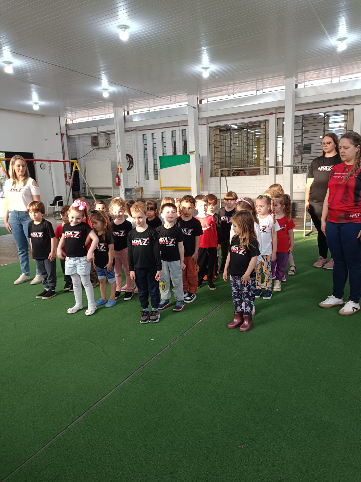 As turmas da Pré-escola 04 anos, com as professoras Tamara e Vanessinha, participaram do hasteamento da bandeira durante a Semana da Pátria.