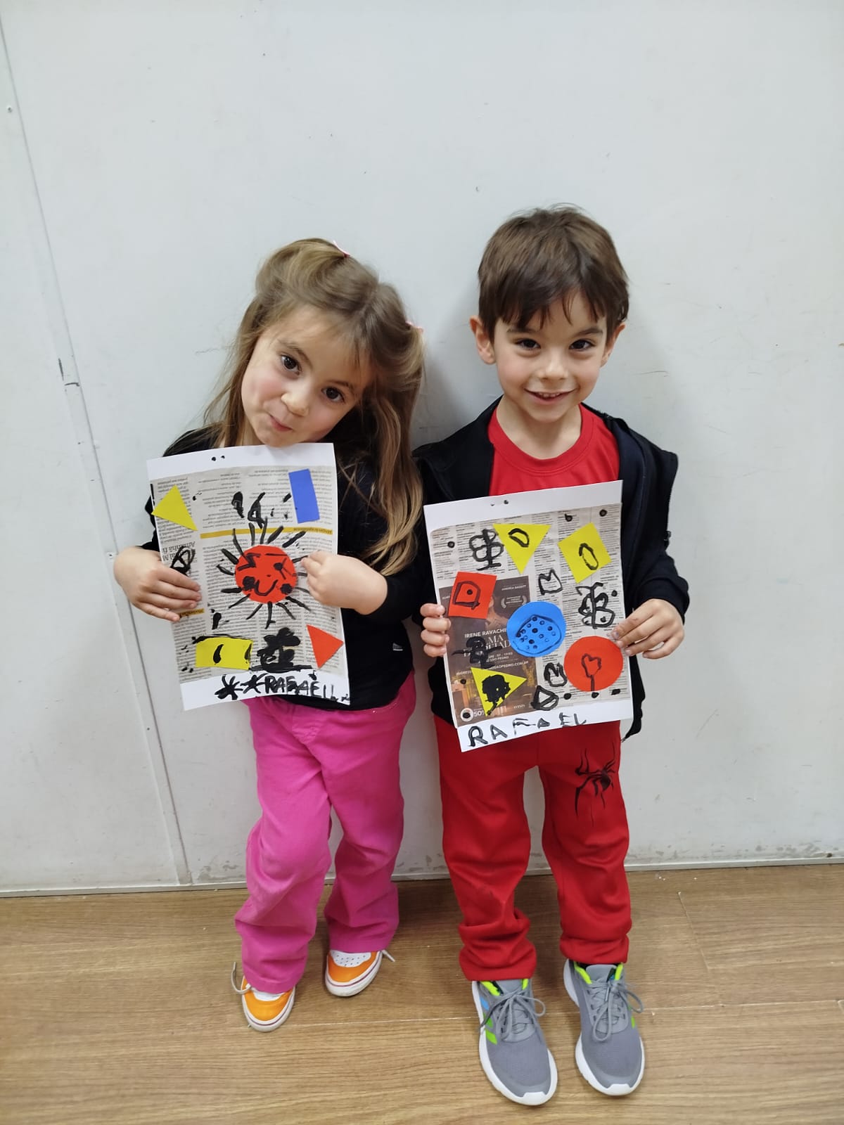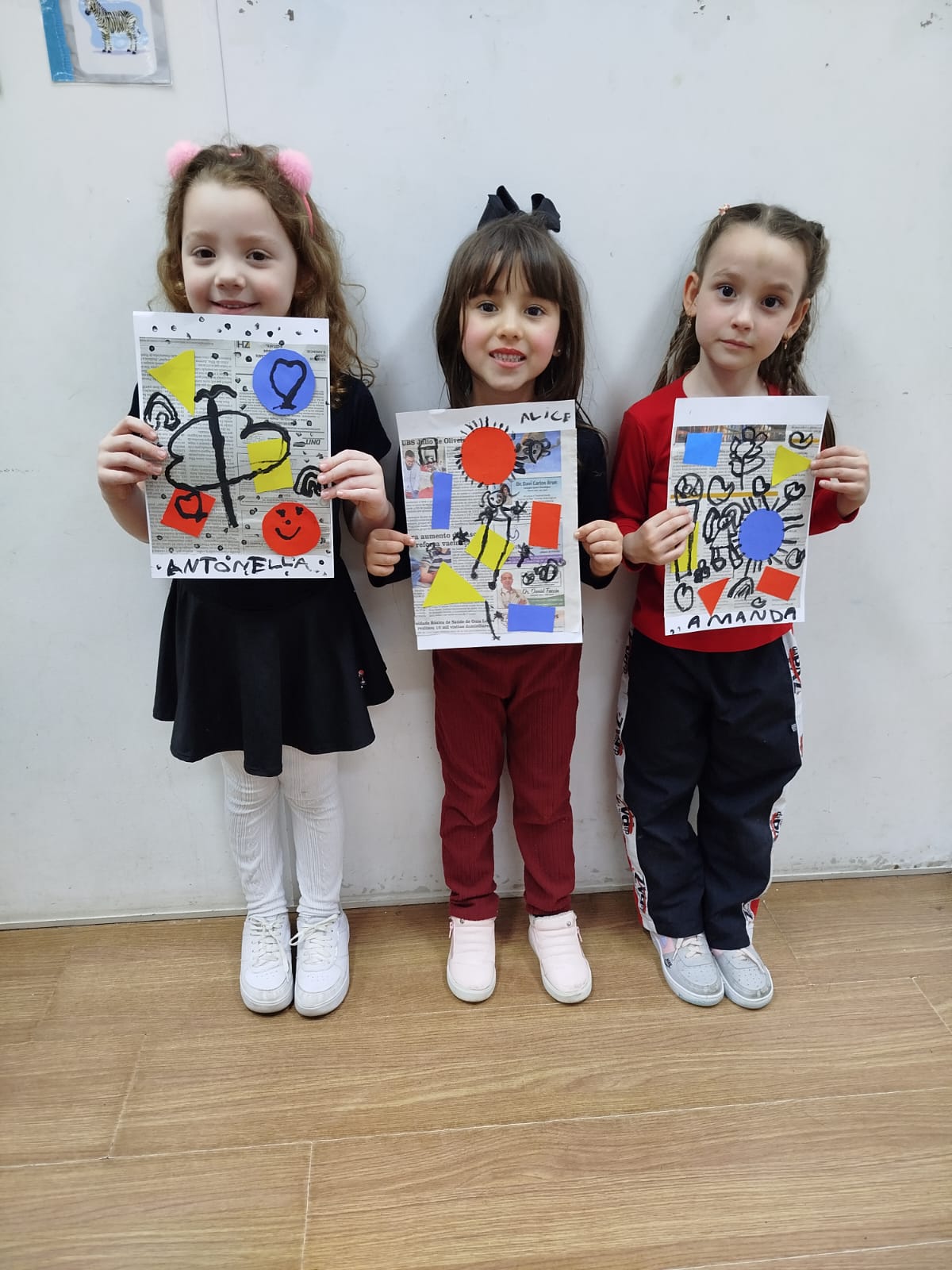 A proposta foi realizar uma releitura da obra do artista Arturo Carmassi. Com muita imaginação, as crianças produziram desenhos com tinta preta e deram um toque especial de interferência utilizando papéis colados.