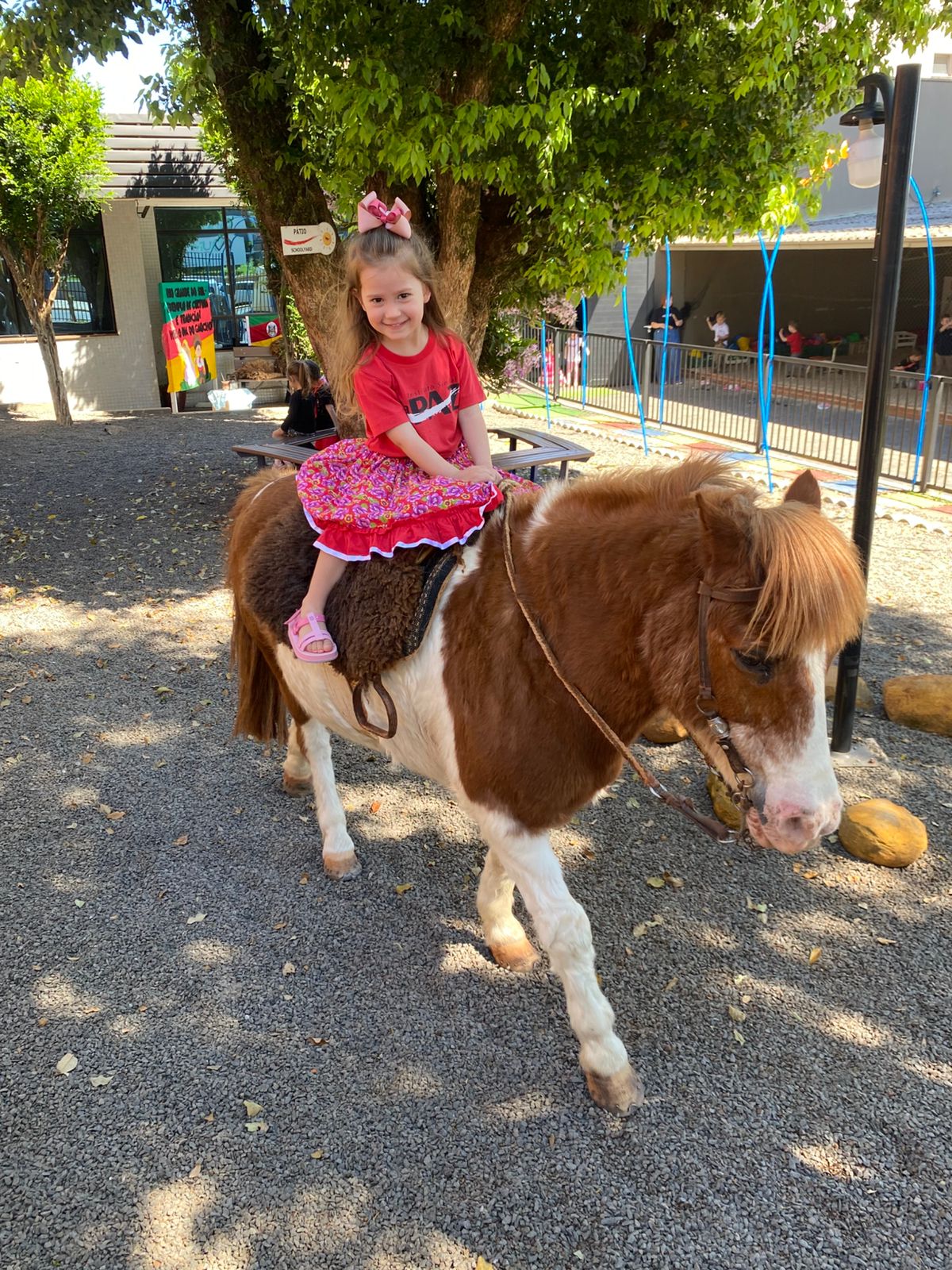 Com sorrisos e olhares curiosos, os pequenos se aproximaram, acariciaram e registraram fotos montados nesse amigo especial, tornando a Semana Farroupilha ainda mais inesquecível.