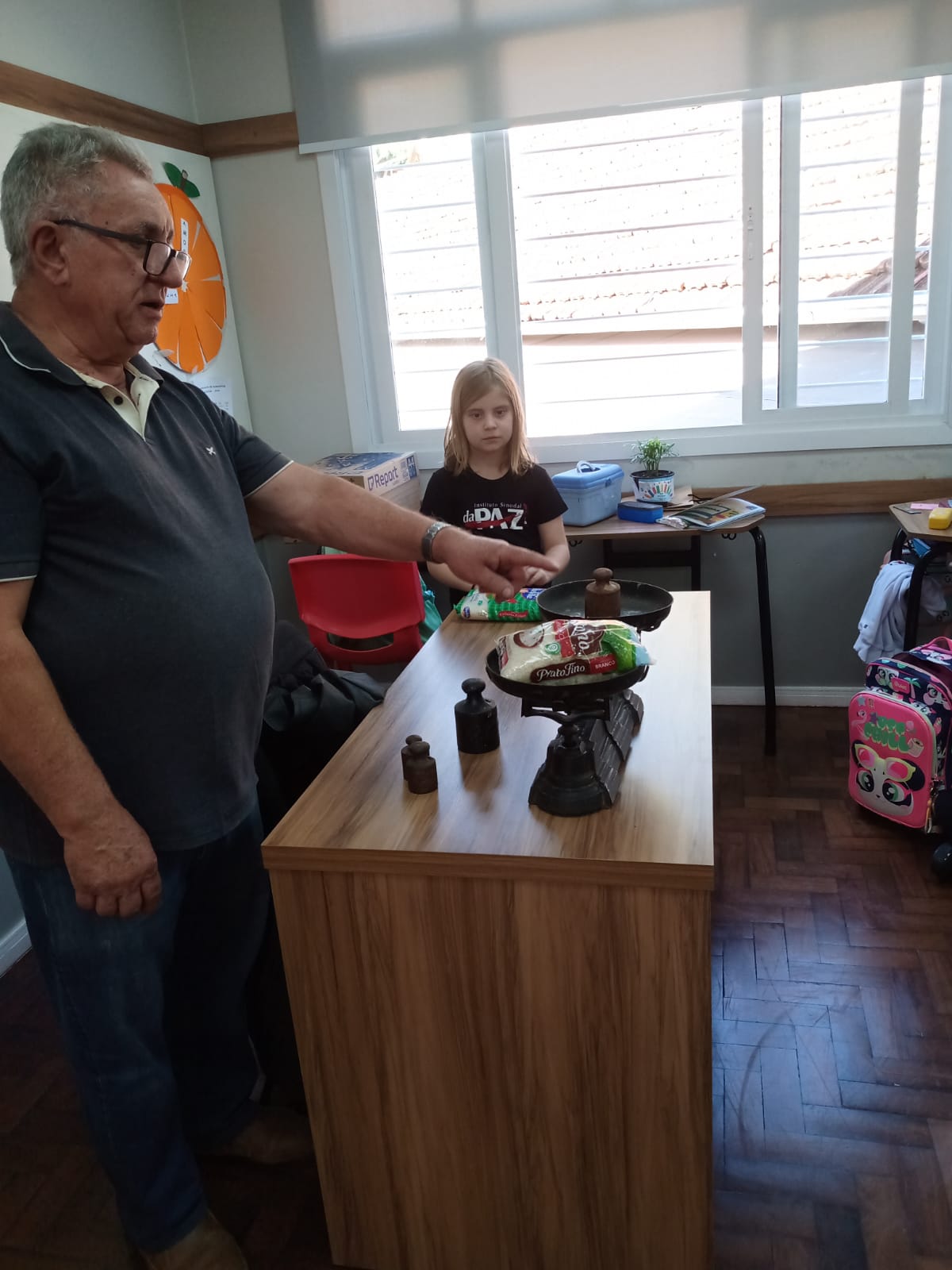 Com muito carinho, o Vô Carlinhos mostrou como funcionava a balança de pratos, utilizada na época em que não existiam balanças eletrônicas nem supermercados, apenas os tradicionais bolichos. ⚖️????