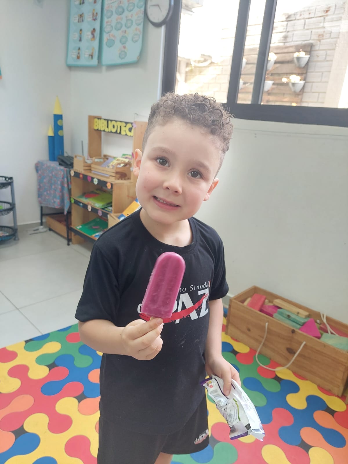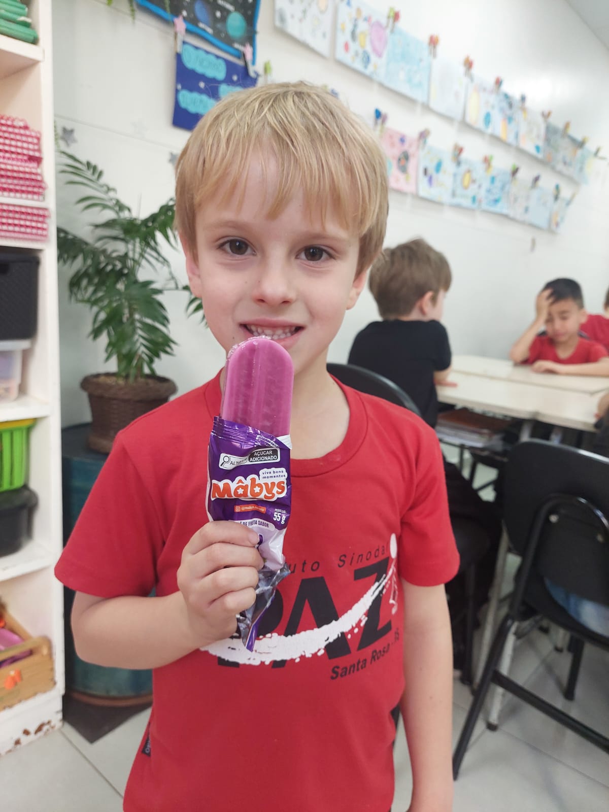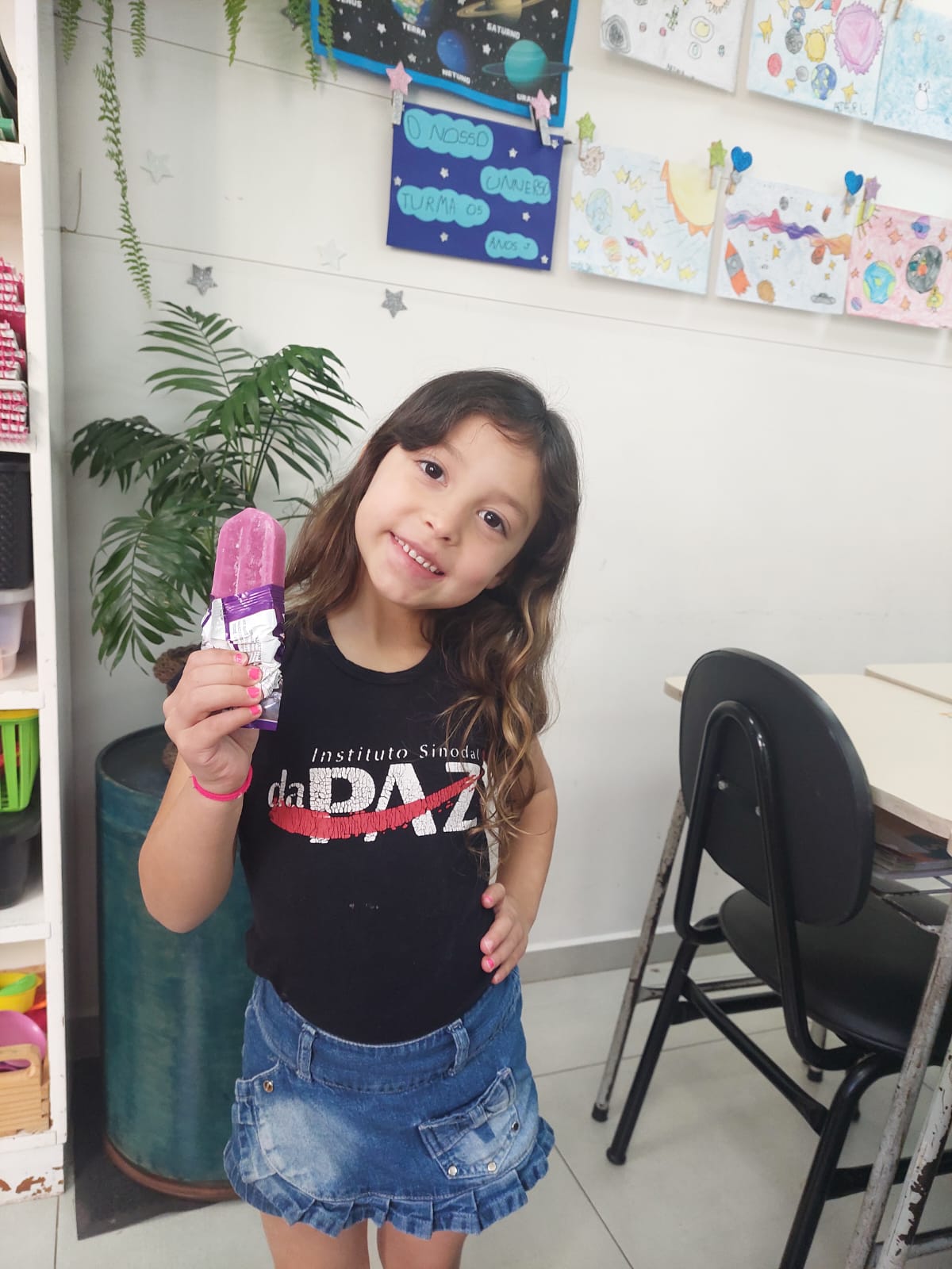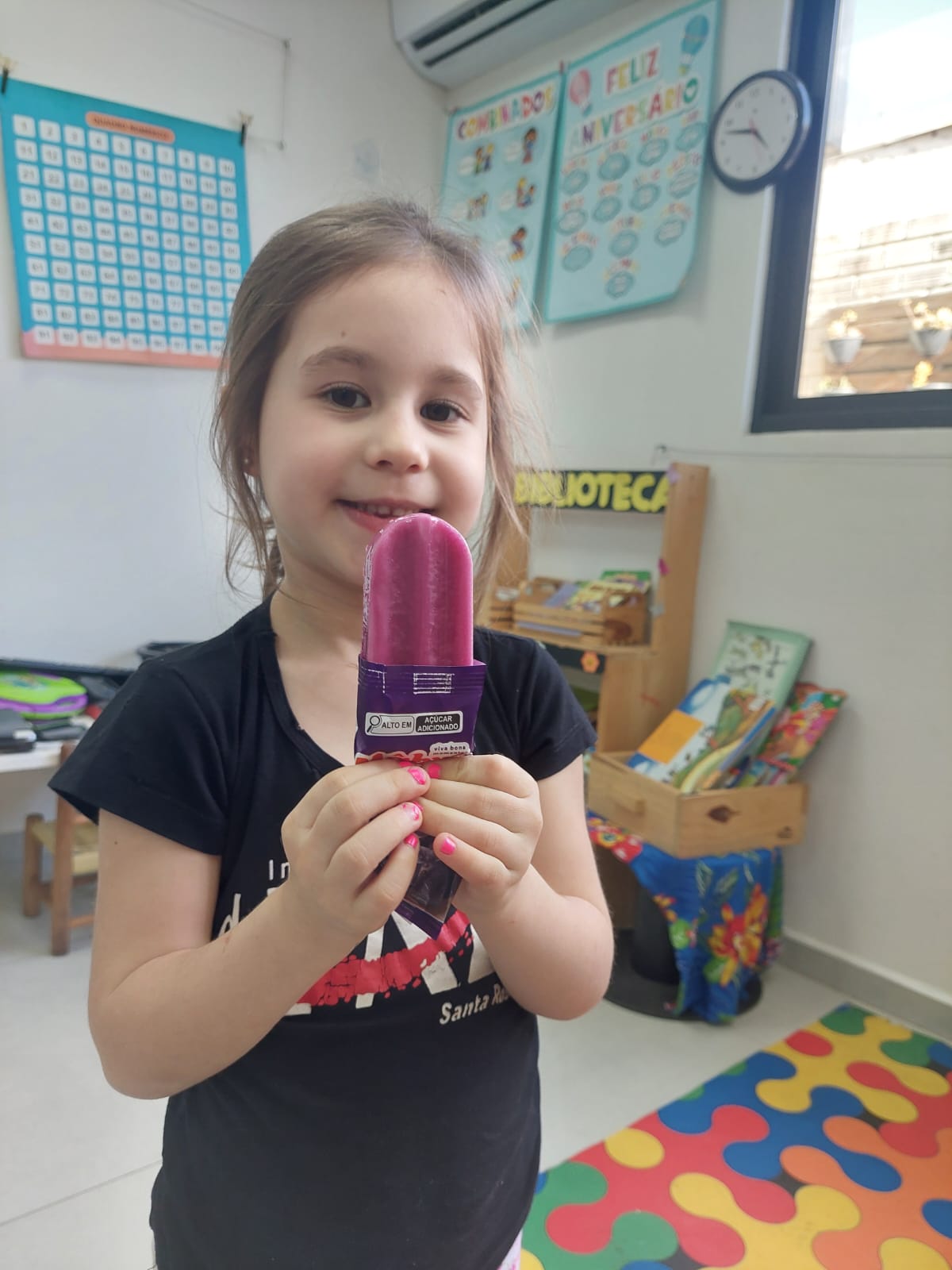 Ainda na Semana da Criança, a turma da Pré-escola 05 anos J, das professoras Janete e Stefani, teve uma surpresa gelada pra lá de deliciosa: um picolé para refrescar e adoçar o dia!