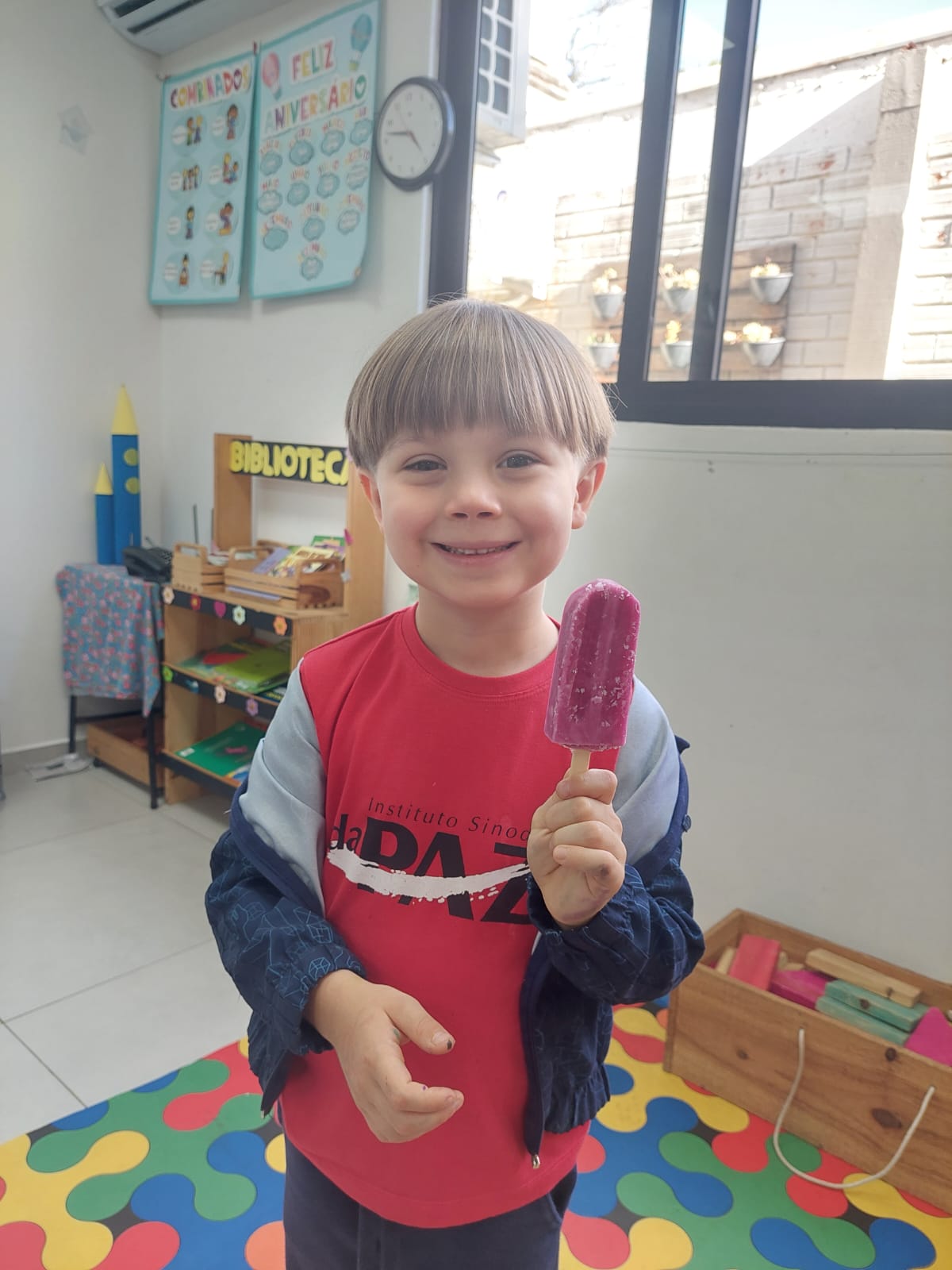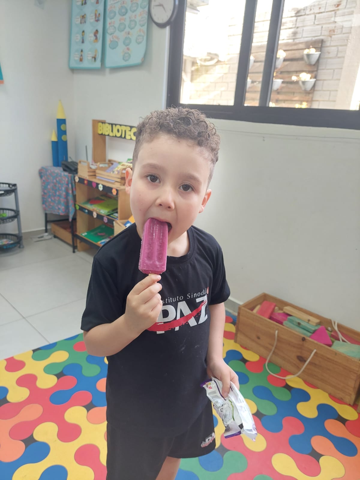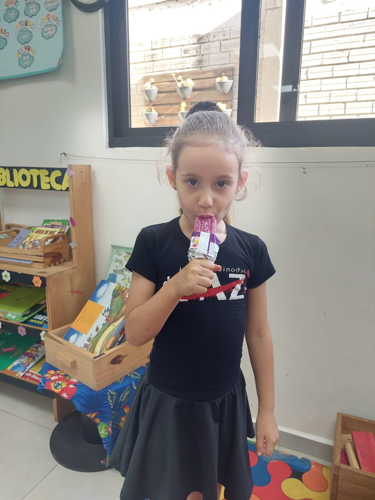 Ainda na Semana da Criança, a turma da Pré-escola 05 anos J, das professoras Janete e Stefani, teve uma surpresa gelada pra lá de deliciosa: um picolé para refrescar e adoçar o dia!
