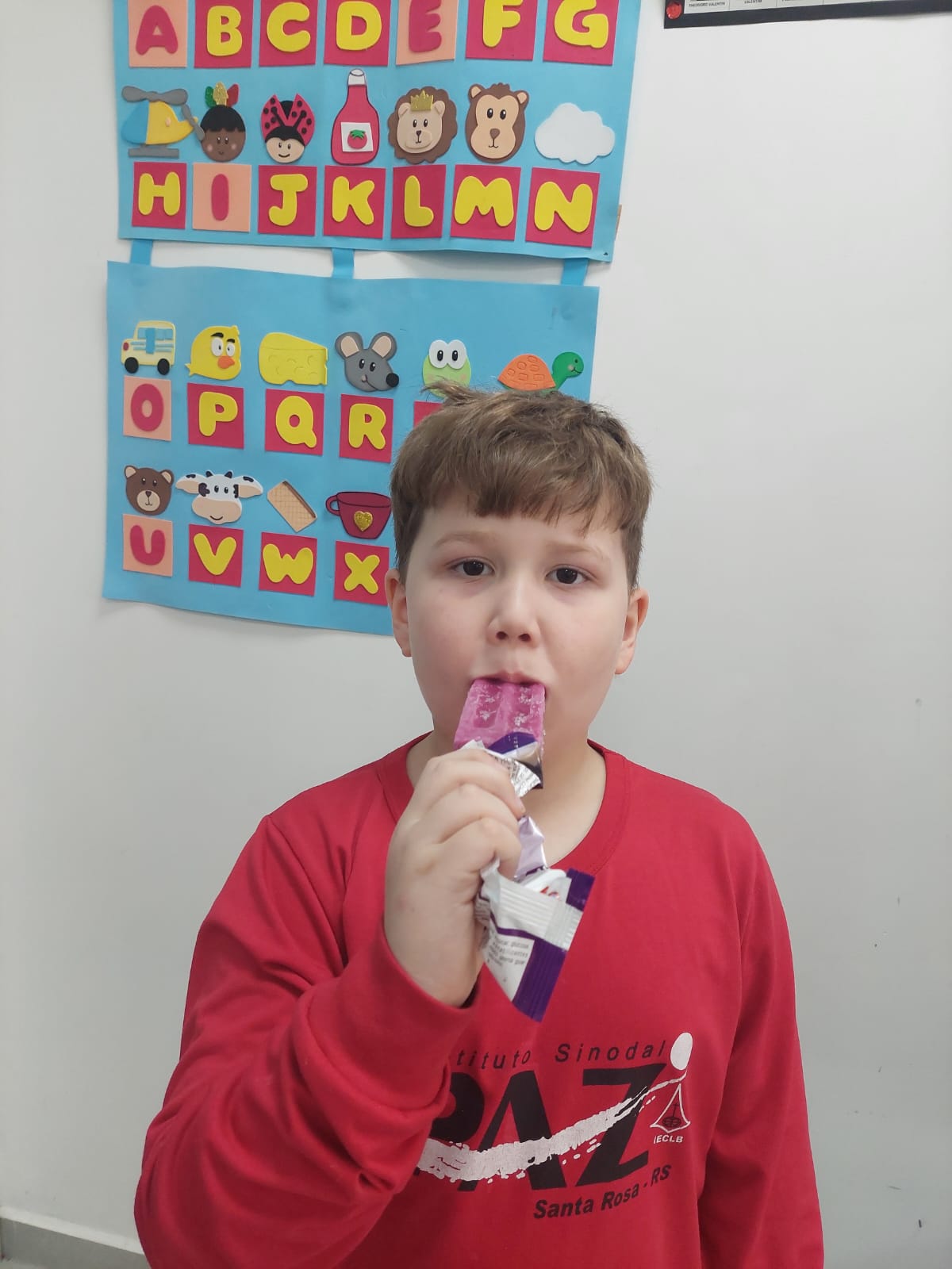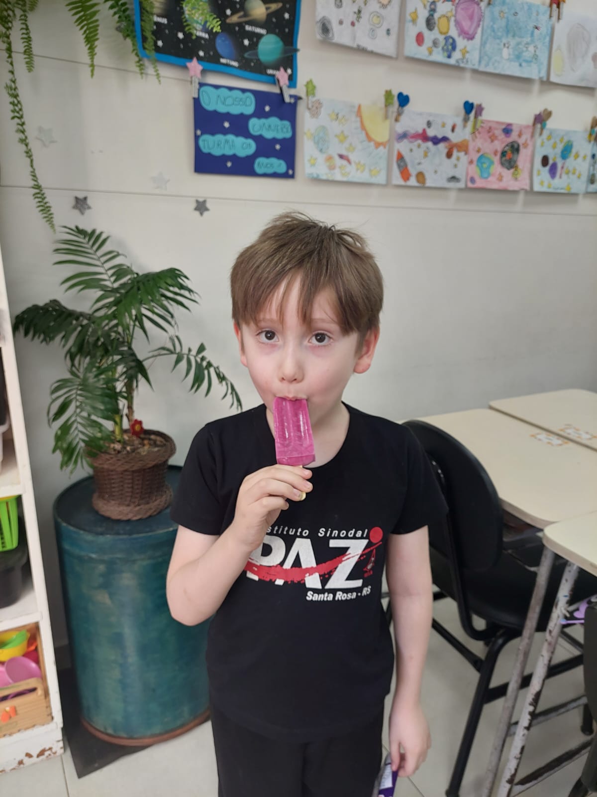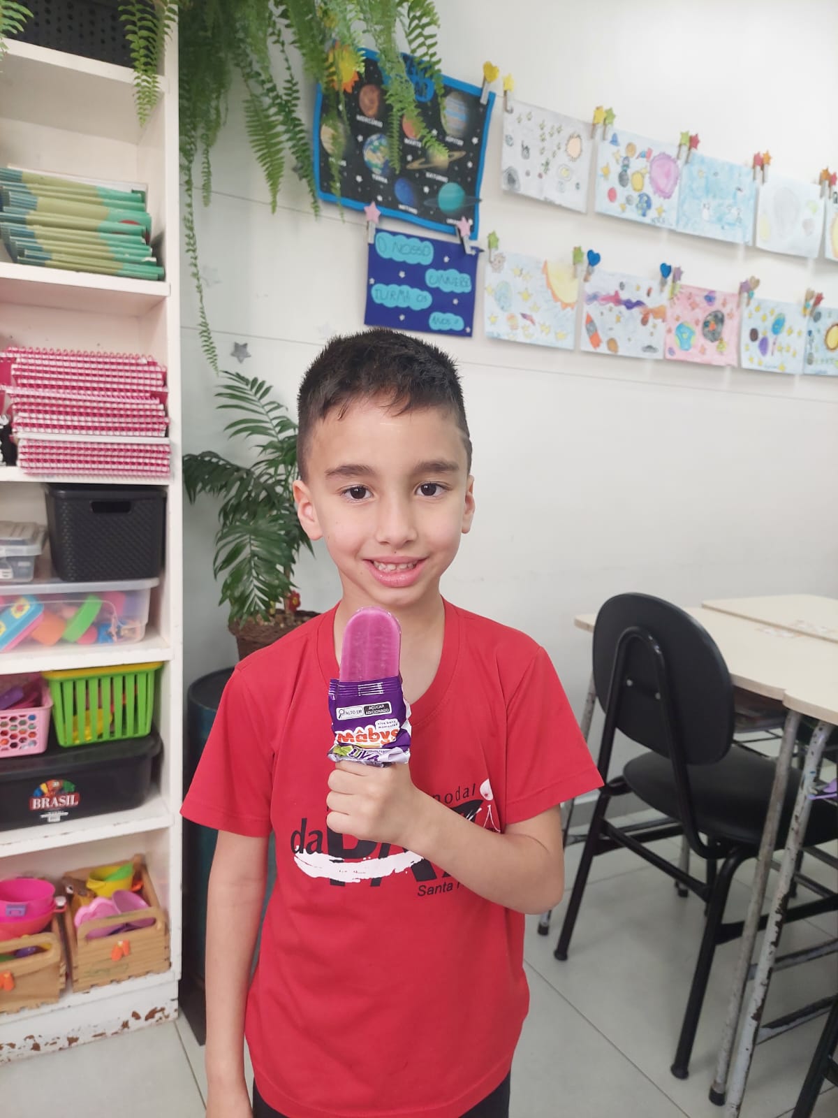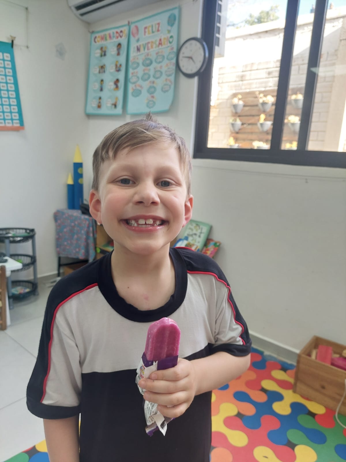 Ainda na Semana da Criança, a turma da Pré-escola 05 anos J, das professoras Janete e Stefani, teve uma surpresa gelada pra lá de deliciosa: um picolé para refrescar e adoçar o dia!