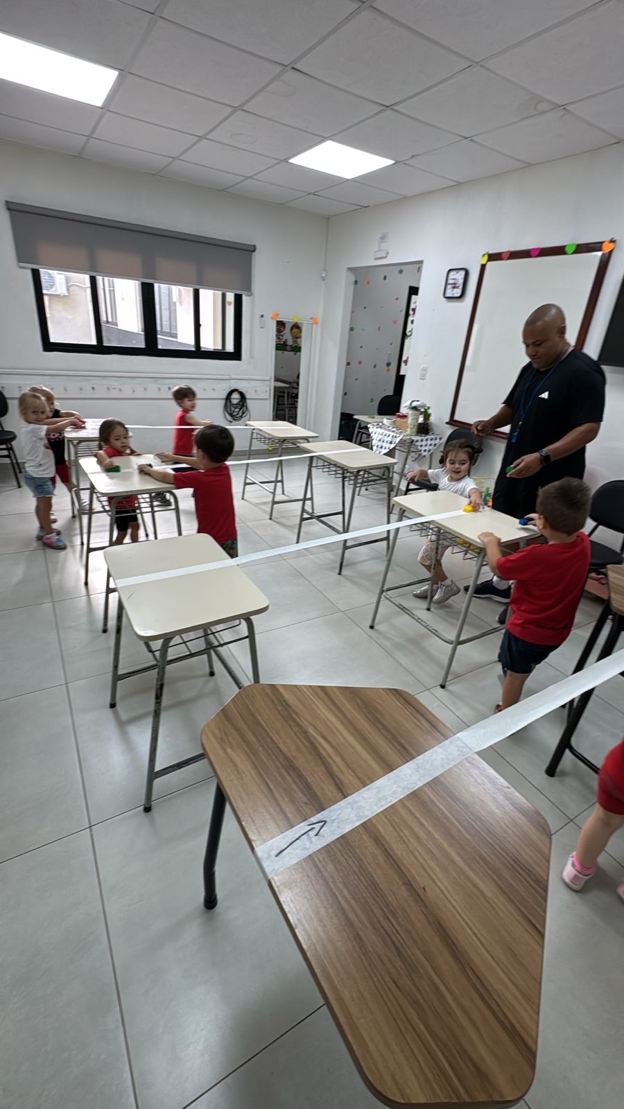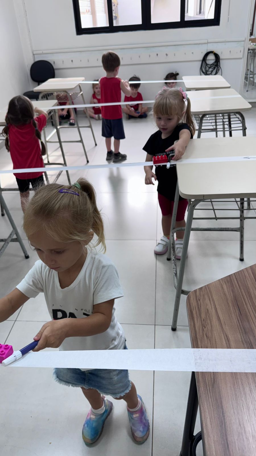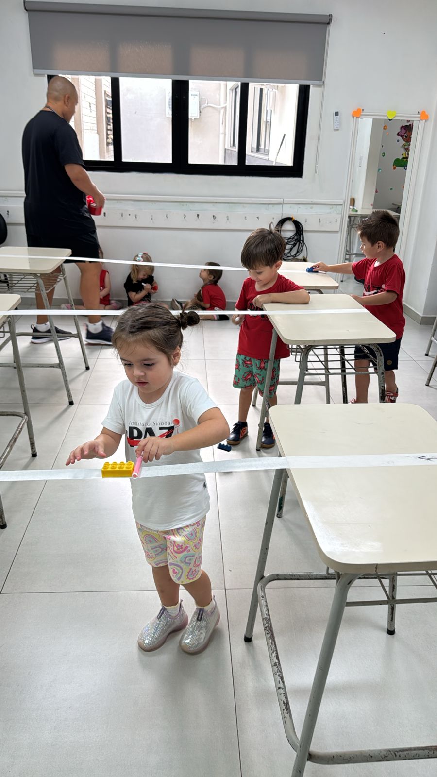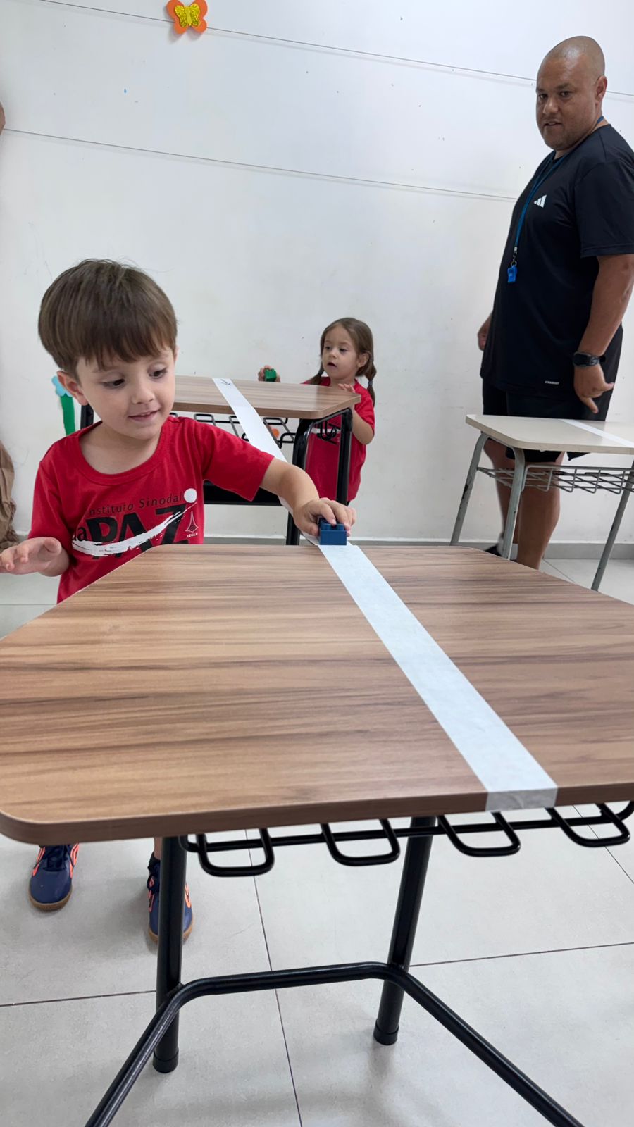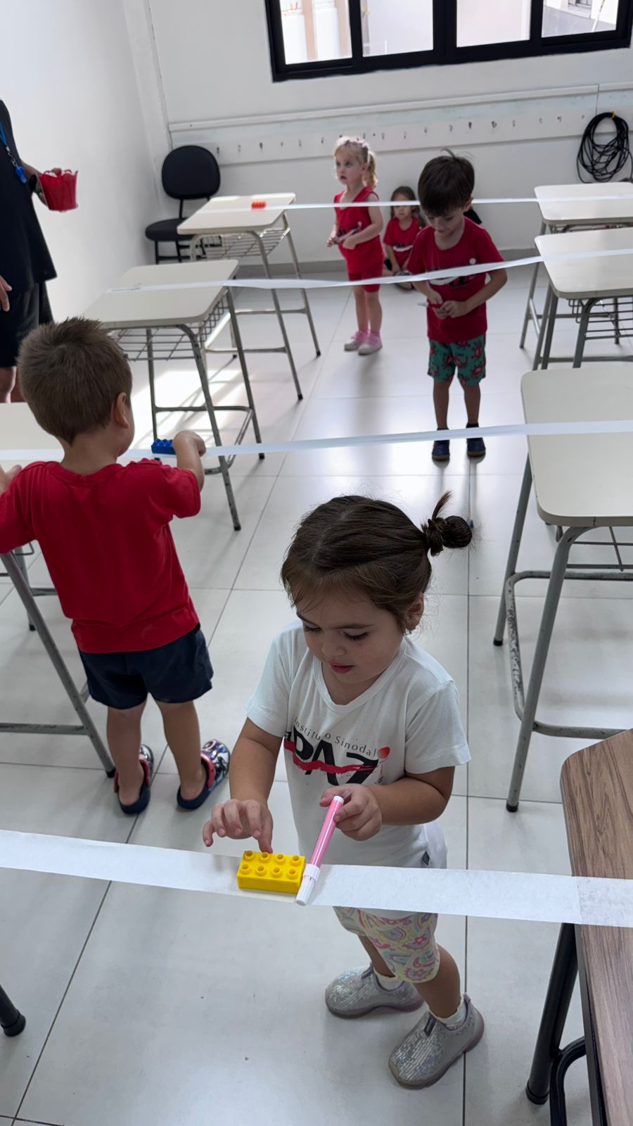 Na aula de Educação Física com o professor Rafael, a turma da Educação Infantil – 03 anos V participou de uma atividade cheia de desafios e descobertas. Conduzindo um bloco sobre uma fita suspensa, as crianças trabalharam equilíbrio, concentração e coordenação motora fina, explorando movimentos com atenção e cuidado.