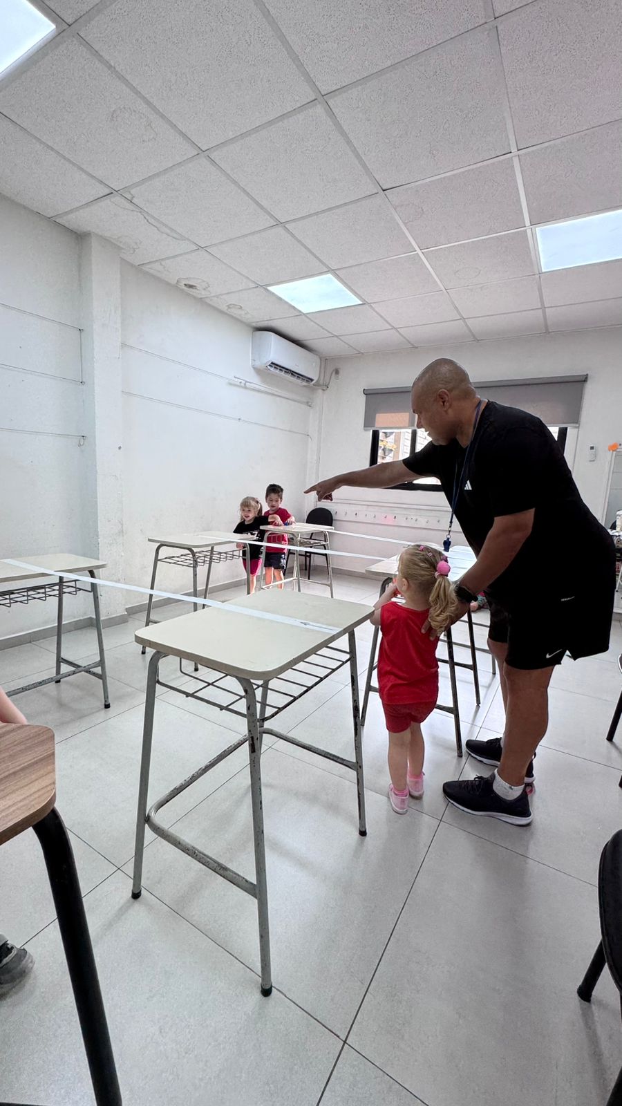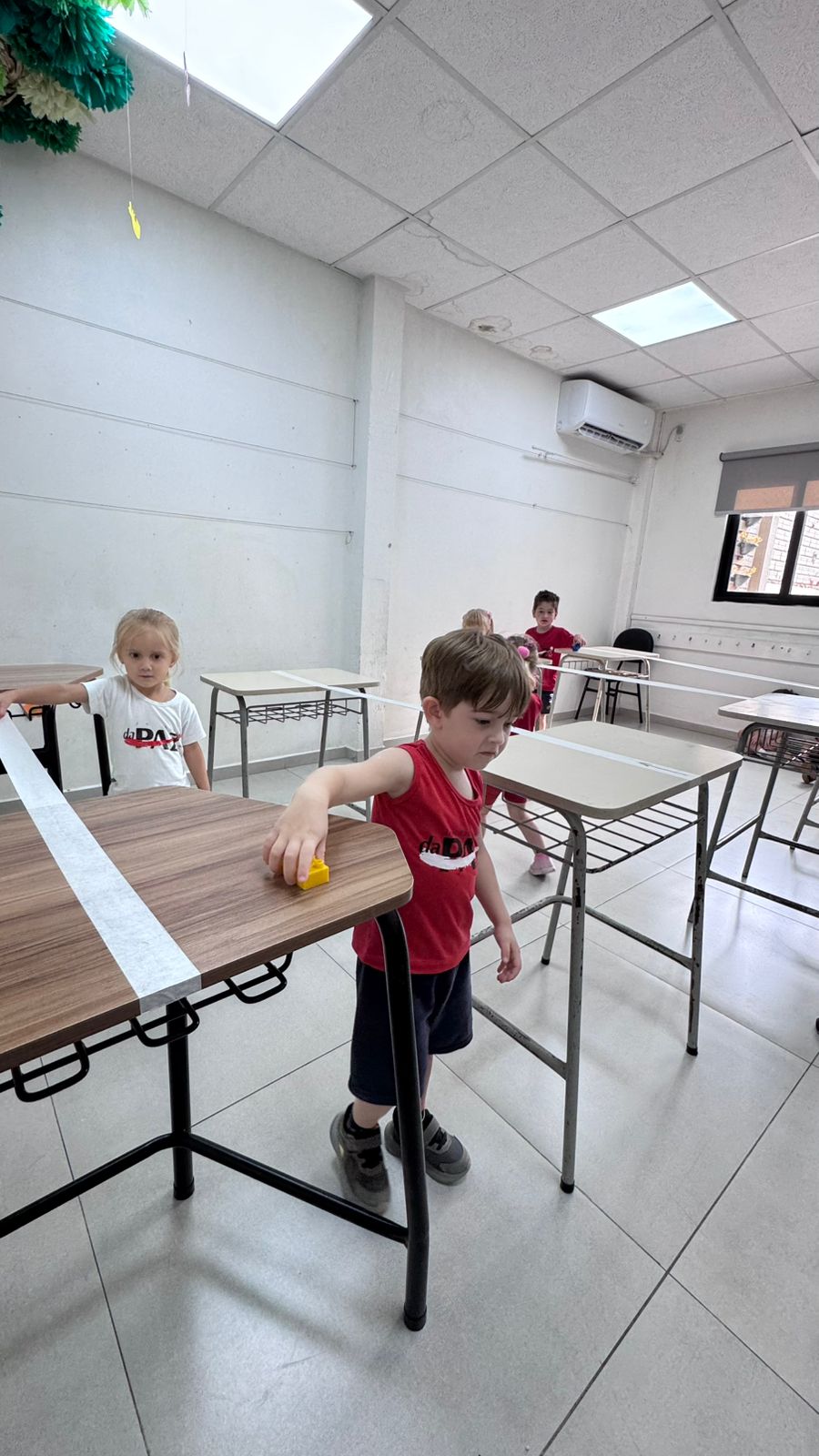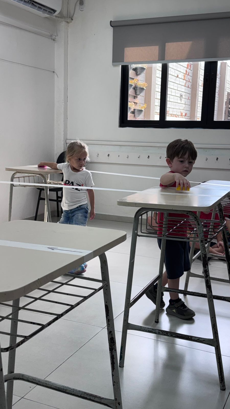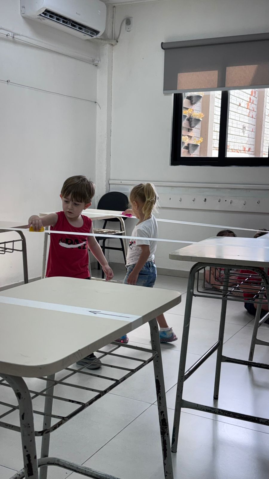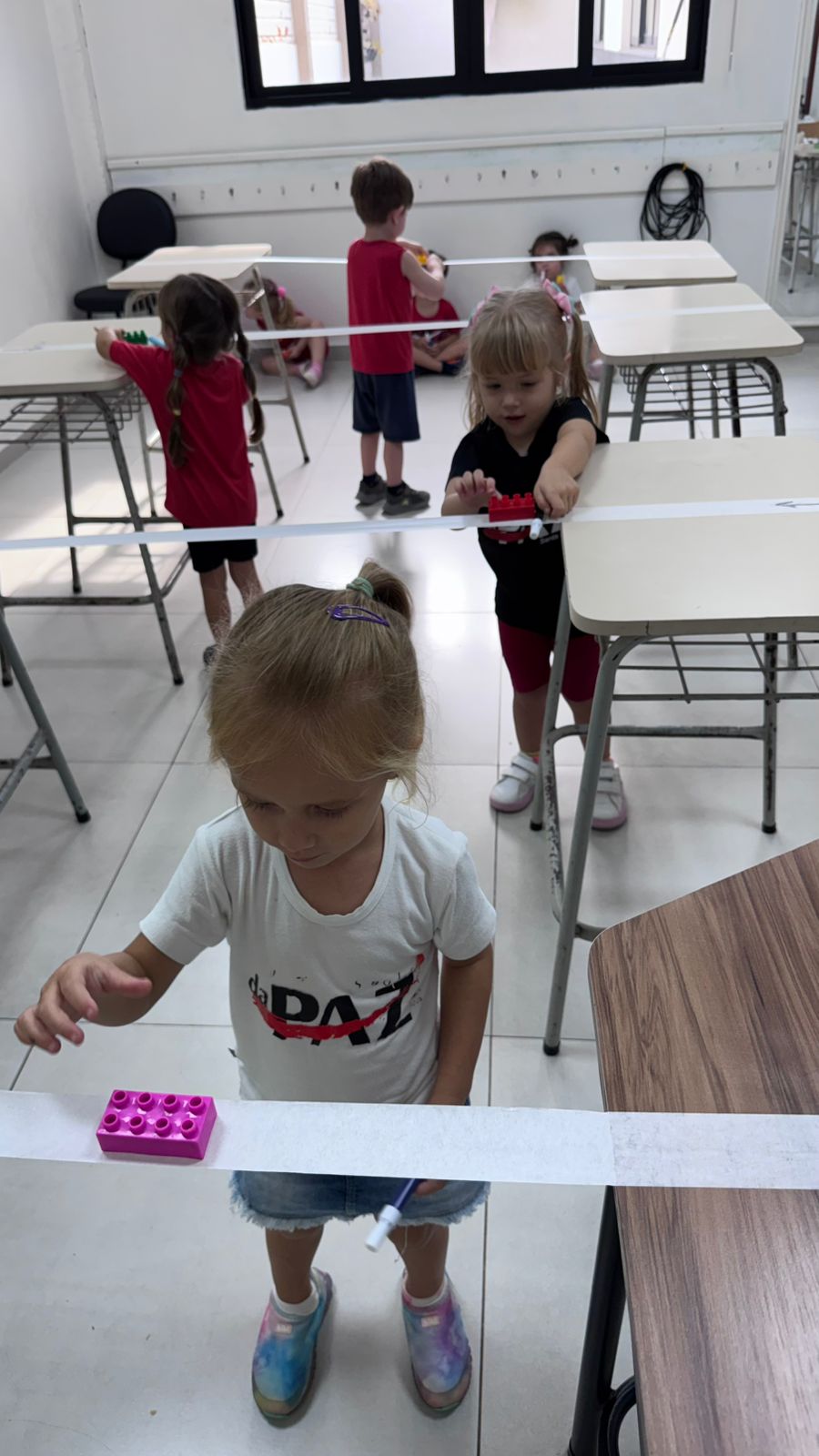 Na aula de Educação Física com o professor Rafael, a turma da Educação Infantil – 03 anos V participou de uma atividade cheia de desafios e descobertas. Conduzindo um bloco sobre uma fita suspensa, as crianças trabalharam equilíbrio, concentração e coordenação motora fina, explorando movimentos com atenção e cuidado.