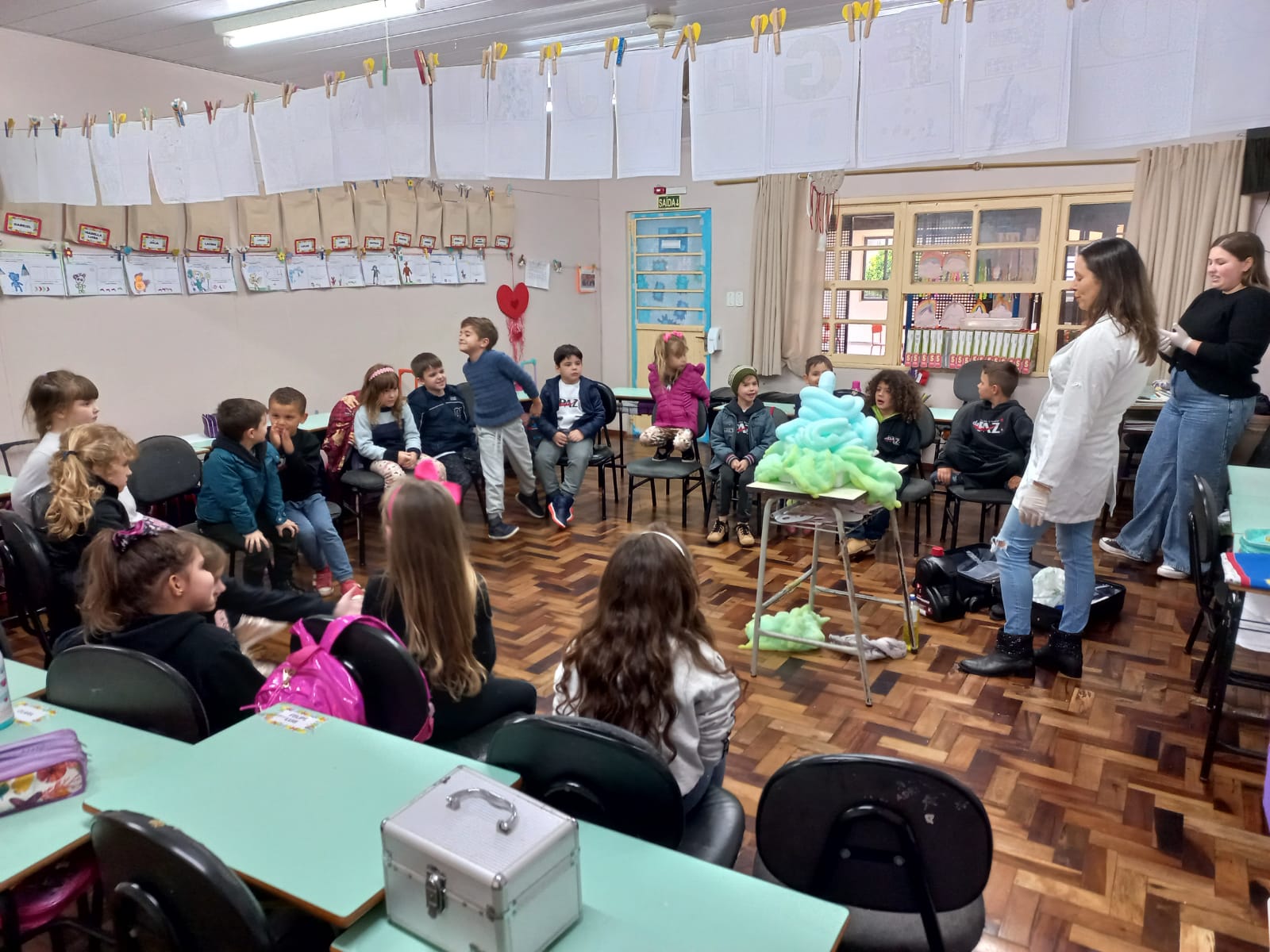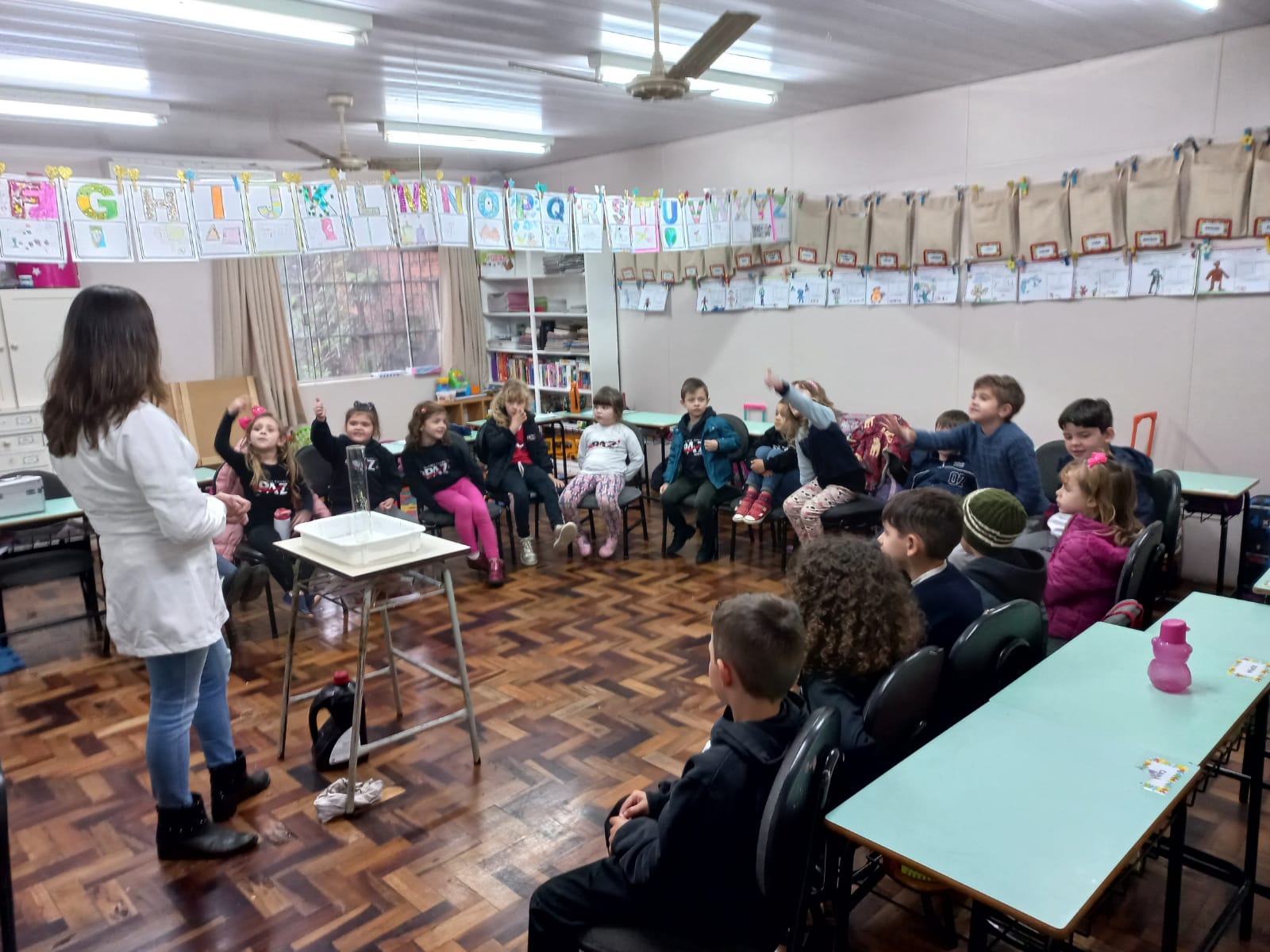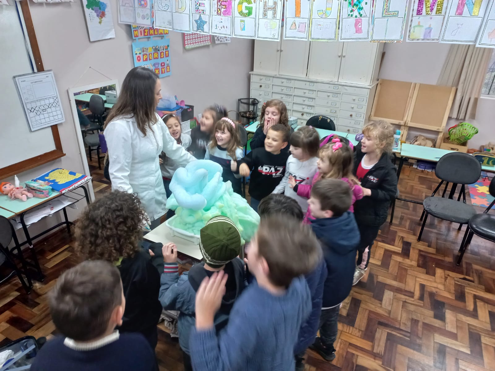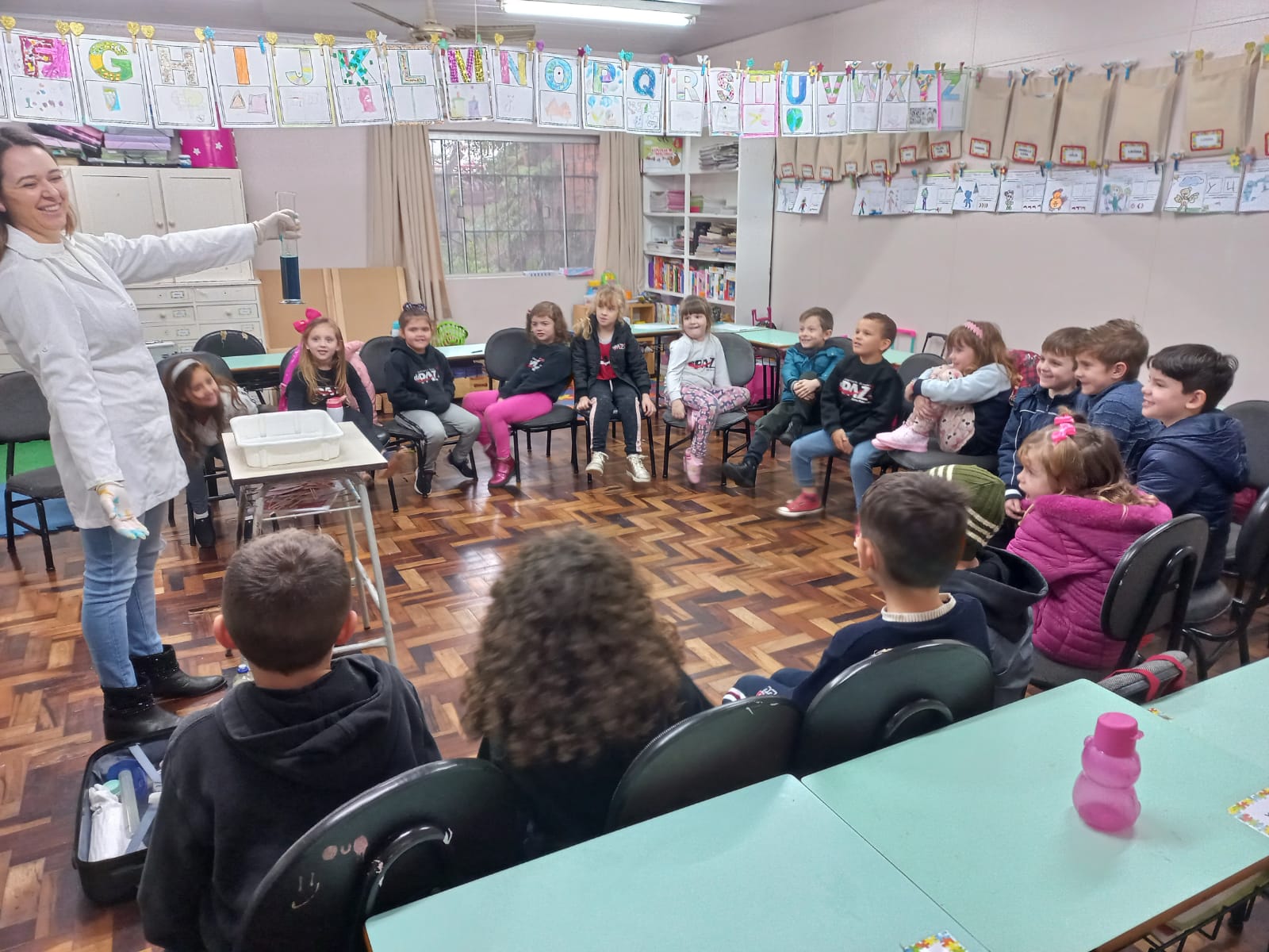 A Mamâe Eva, que é professora de uímica do Da Paz, prepareou uma experiência muito legal e realizou com as crianças.